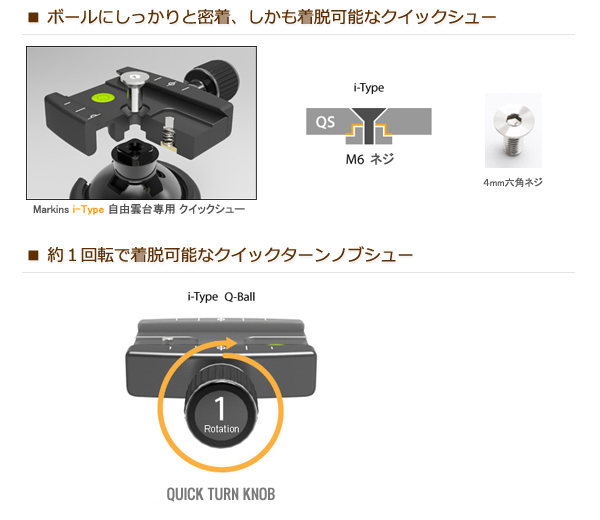 - 約一回転で締め付け可能なクイックターンノブシュー採用